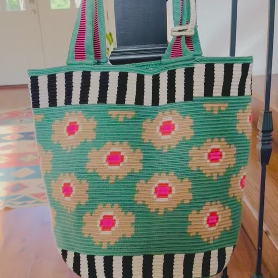Add a touch of artisanal beauty to your look with this stunning oversized Wayuu bag, handwoven by Wayuu artisans in Colombia. Featuring a vibrant green base, delicate pink and beige floral patterns, and bold black stripes along the top and bottom, this one-of-a-kind tote blends tradition with boho chic elegance.