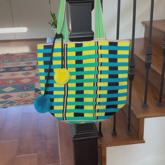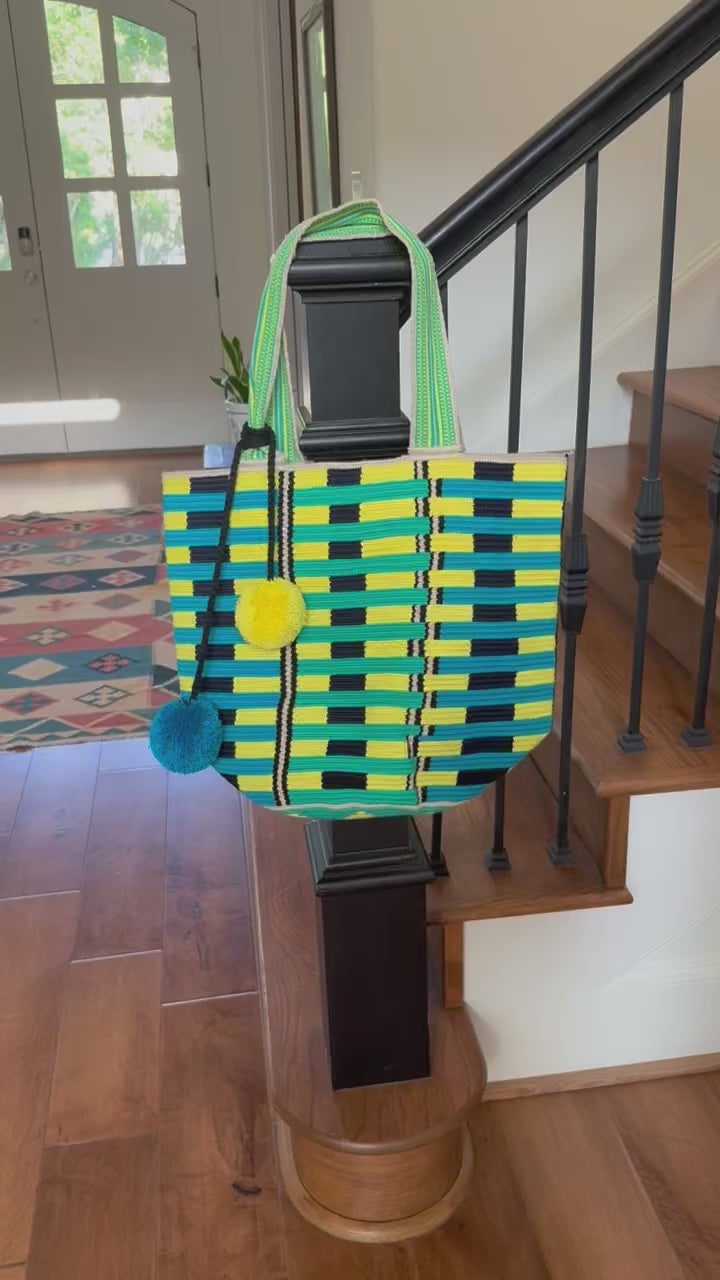 Make a bold statement with this vibrant Wayuu tote bag, handcrafted by Indigenous artisans in La Guajira, Colombia. Its unique interlocking pattern in shades of bright yellow, teal, and green is full of energy and culture. The bag features wide handles for comfortable carrying, and playful pom poms in yellow and teal that add a fun touch. Spacious, lightweight, and made with love, it’s perfect for summer outings, beach days, or everyday adventures.