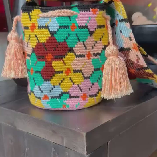 Crochet. Each Bag is carefully hand-knitted by skilled Colombian Artisans using traditional Wayuu weaving techniques.