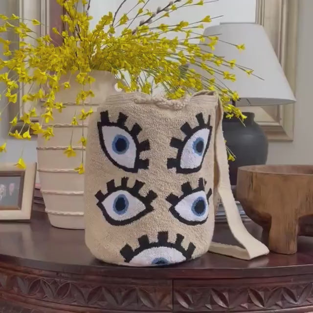 Discover a one-of-a-kind treasure with this handwoven Wayuu bag, crafted using the traditional Puyado (tapestry crochet) technique, similar in texture and intricacy to needle punch embroidery. This exquisite piece features a soft, light beige base adorned with bold, woven eye designs in rich shades of blue and black, evoking protection and spiritual energy.
