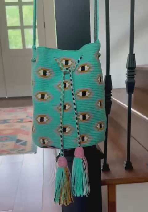 Step into the world of artisan luxury with this handmade Wayuu mochila bag, crafted with love and mastery by the Indigenous Wayuu women of Colombia. This fine crochet crossbody bag features a vibrant turquoise base adorned with dozens of intricately woven "ojitos" (little eyes) in pops of mustard yellow, blush pink, black, and white—each one full of meaning, charm, and cultural expression.